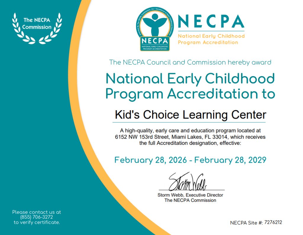 NECPA Accreditation recognizes Kids Choice Learning Center for meeting rigorous standards of quality, safety, and educational excellence. This achievement underscores our commitment to the children and families we lovingly serve.